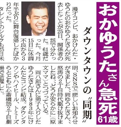 @YahooNewsTopics【漫才師おかゆうたさん死去 61歳】 news.yahoo.co.jp/pickup/6473310