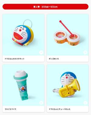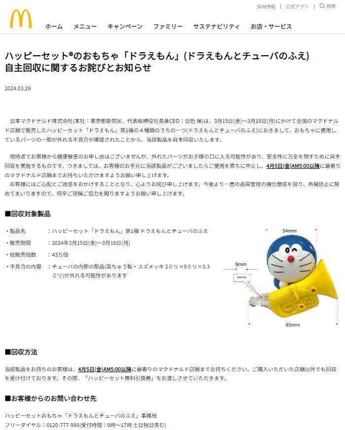 | マクドナルド、「ハッピーセット」おもちゃを自主回収 対象製品は「ドラえもん」のおもちゃ『ドラえもんとチューバのふえ』 日本マクドナルドは29日、公式X(旧ツイッター)にて、ハッピーセットで展開中の「ドラえもん」おもちゃを自主回収することを発表。お詫びコメントを投稿した。 (出典:オリコン) |